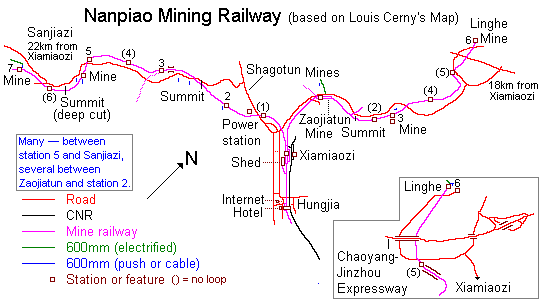 Louis Cerny has made two major and two minor steam operation discoveries: NANPIAO MINING RAILWAY This 100% steam powered system, located northwest of Jinzhou in Liaoning province, is a Tiefa-type operation which heads three directions out of Xiamiaozi (where the engine shed and interchange yard with CNR are located) through mountainous territory with steep grades and much curvature. The three lines head generally south-west to Sanjiazi (22 km), north-east to Linghe (18 km), and south to Hungjia (4 km), plus there are at least three spurs over one km long. The Sanjiazi and Linghe lines have four passenger round trips a day, while the Hungjia line has eight round trips. The Hungjia line is paralleled by the CNR line from the interchange yard, and the CNR and NMR use the same minimal (platform and canopy only) station at Hungjia, but use separate tracks. The NMR uses the name Hungjia (the name of the township) for Nanpiao (the name of the district). There are at least two simultaneous, side-by-side, smokestack forward departures from Xiamiaozi each day, one being witnessed at 1500. (Not strictly true, the morning departures are staggered. RD) Freight traffic is heavy, with a freight usually on both the Sanjiazi and Linghe lines at any one time. The first station east of Xiamiaozi is a valley mining town and as many as three engines were seen shunting here at one time from the pedestrian bridge. Freights get down to slow speeds on the two summits on the Sanjiazi line and one major summit on the Linghe line. All locomotives seen were SY's, with smokestack on the end away from Hungjia and Xiamiaozi. There is no wye where the Sanjiazi and Linghe lines divide. There are paved roads close to most sections of the line, and the frequent passenger stops allow some chasing. There are nearly endless possibilities for photographs with mountainous and/or industrial backgrounds. I believe that if this system and Tiefa system had both been discovered at the same time, the Nanpiao Mining Railway would have been considered the more important find of the two. Despite the recent penetration of the eastern fringe of the area by the Chaoyang - Jinzhou expressway, the area the NMR runs in is real "back country," and remains in many ways like China in the 1980's. There are no hotels in Hungjia that I could recommend by the standards of Tongliao, Chabuga, or Reshui. (Probably it would be best to stay in Jinzhou.) Though I have come to expect surprised looks during my "new discoveries" explorations, here many local people stared at me incredulously with mouths agape as if they were seeing a space alien (no snickering out there, I'm not THAT ugly). I found out later I was not only the first person ever seen here photographing trains, but also the first non-oriental person ever seen in most of the towns. The person that told me this (through my translator) was a local police official who, though polite and courteous, insisted I give him my exposed film. Though I explained that what I was doing was common elsewhere in China, being the first rail photographer here I felt it best not to be too confrontational. I think the police official was simply reacting to what to him was an unprecedented situation. (The thought of an Arab railfan dressed in traditional robes and headgear taking pictures on an obscure coal mine branch in the southern Appalachian Mountains in the U.S. came to mind.) Hopefully the officials will see that the photos are not objectionable and will find after checking that this type of activity is common on other steam lines in China, and this will allow all future rail photographers here not to face the same situation.