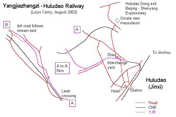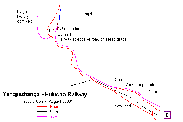 YANGJIAZHANGZI - HULUDAO (JINXI) RAILWAY This line operates from inside the city of Huludao (which was previously known as Jinxi) up through rural, hilly countryside into the mountains at Yangjiazhangzi, where its major customer, the Bohai Cement Company, is located. My understanding is that it has 4 JS and two SY, and I saw two JS (6307 and 8207) and one SY (0513) in operation. The SYs seem to be confined to shunting duties in Huludao, while the JS handle traffic up into the mountains on a 40-km line that is separate, but confusingly intertwined with, Chinese National Railways (CNR) lines in the area. In some places the two lines appear almost like one double-track railroad, while in others the alignments are completely separate, and only the Yang-Jin goes to Yangjiazhangzi. The line has turning facilities at both ends, so that the locomotives operate smokestack forward in both directions. Two summits cause the heavy trains to drop below 10 kph, but in other places they run as fast as 75 kph. Paved highways and roads give good access to the last 15 km into Yangjiazhangzi, which is the stretch of line where the steep grades and curvature are located. At one place the railroad is immediately next to the edge of the highway pavement, this being at a point of maximum demand on the locomotive as it approaches a summit. An important public street crosses the east end of the Y-J yard in Huludao, and the engine shed is just west of this crossing. This yard is the interchange point with the CNR. The Huludao Hotel, located across from the main CNR station, is an excellent value with a luxury appearance and clean, well-maintained rooms from 50 to 120 Yuan. The prices are posted over the reception desk. Credit for discovery of the Y-J goes to Fu Jie of Sun Xiaolan's organization, who visited the line before my trip.