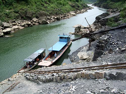 Click here for the main Shibanxi Holiday 2009 page. It was time to return to Ma Miao, east and south of Bagou on the map, our plan was to take a boat up to the dam below Huangdan (bottom left) visiting the waterside coal mines on the way. It was raining when we left Bagou, but not significantly, and we made good progress. This time the mine featured before was working and I spent an hour here mainly shooting video. The battery electric loco wa s in pieces and all horizontal movements were man powered. The first skips up were spoil which ascended the incline to be dumped: Later coal of dubious quality surfaced and was stockpiled: Tipping of the next wagon didn't go quite to plan, I have the extraordinary action on video: When I reached Ma Miao, our expected ferry was not available and we joined what appeared to be a regular Monday public ferry, with the promise it would go further than normal if we paid... By now the sun was out and I was wilting after all the rush to get filming complete, we had brought just one camera to keep the weight down. Even a cold beer couldn't revive me: The scenery was magnificent again, of course, and in due course we lost our passengers: