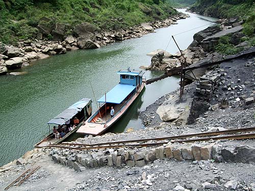 In the same area in 2009, this riverside mine (actually it's the upper part of the lake behind a man made dam) apparently used an incline (behind right) to ship out coal although a new road/bridge was under construction. The boats shown are passenger ferries: